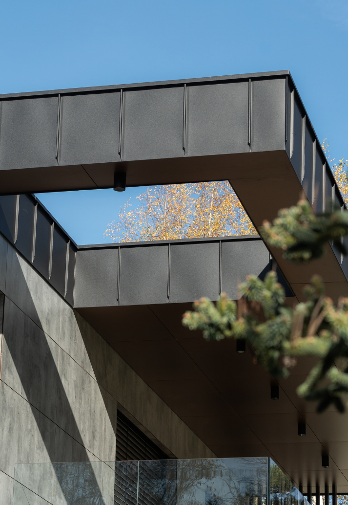 Budynek wyróżnia się licznymi elementami betonowymi, w tym ścianami wykonanymi z betonu „na gotowo”, co podkreśla surowy, minimalistyczny styl całej konstrukcji.